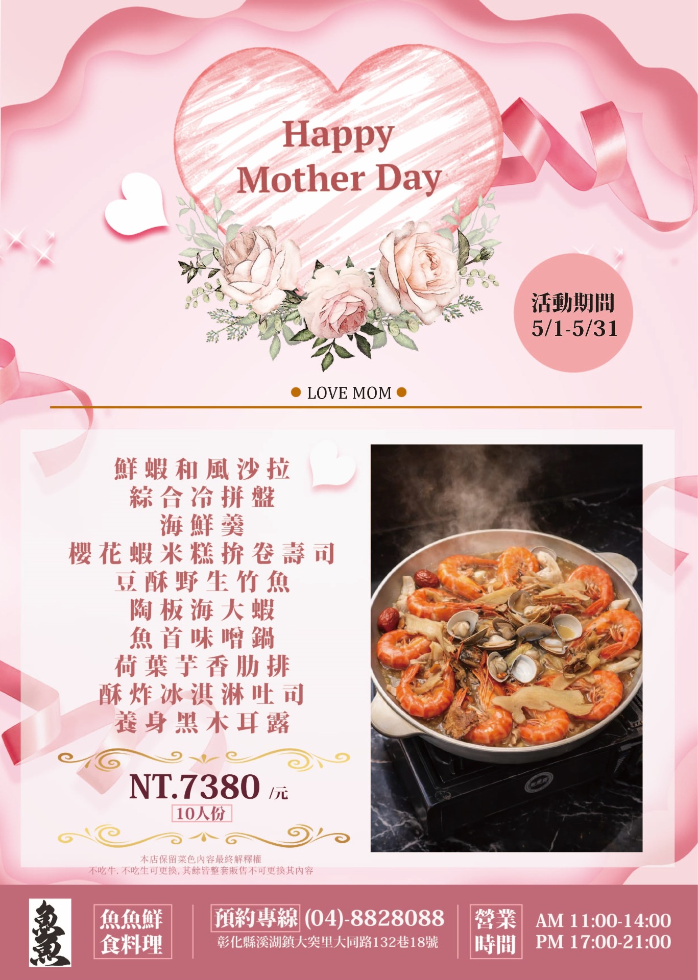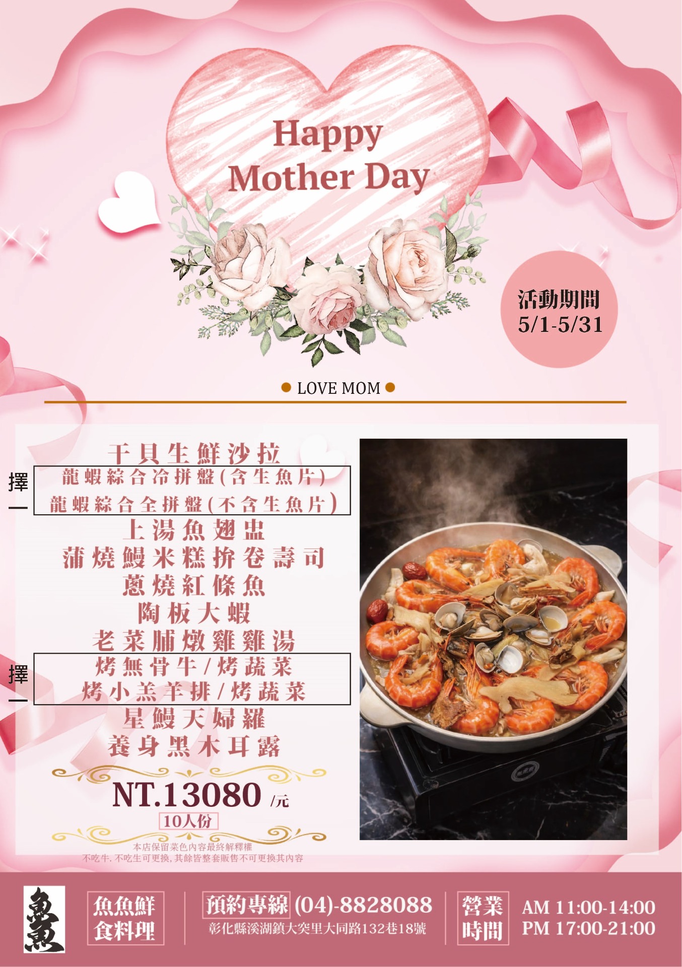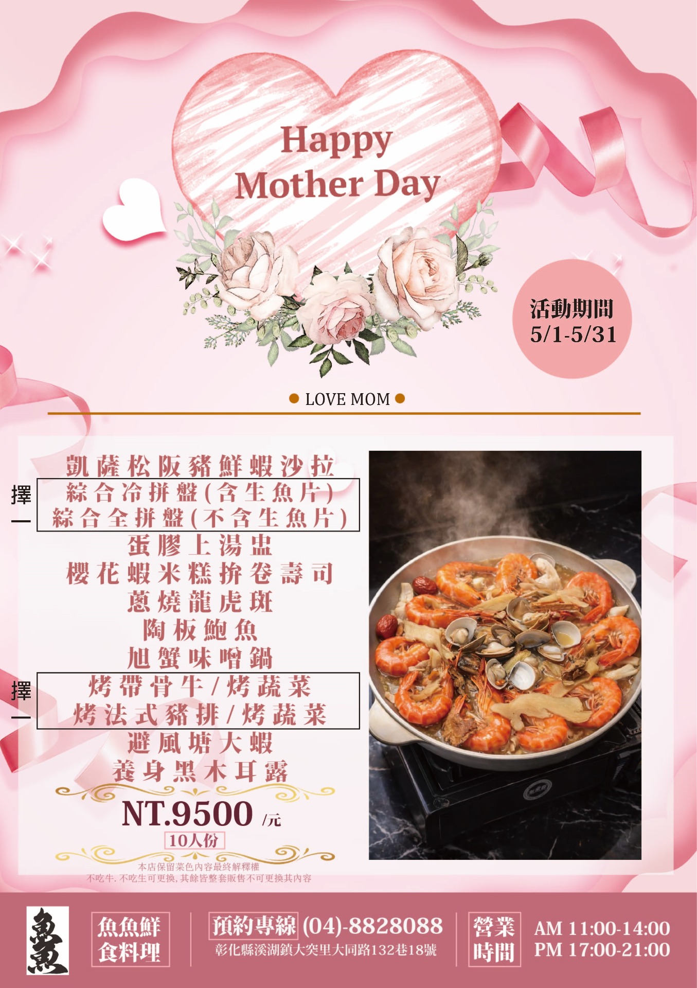 - 5/2.5/3.5/9.5/10逢母親節連假,訂購內用位置皆須預付每桌3000元訂金